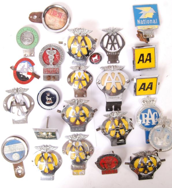 A collection of 20+ assorted vintage car badges - largely all AA or RAC, but some others included. Earlier chrome AA badge, an AA box key, British Medical Association badge, National Mercury Club badge (AF), a vintage Tax Disc from a Mini Motor Bicycle (OAE 299) in 1958, and others. Interesting collection.