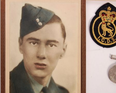 A WWII Second World War related collection of militaria, all presumed related, to include; 2x WWII War Medals (no ribbons), 2x unframed photographs showing military group / regimental photographs and a coloured aquatint-type photograph of an RAF serviceman, and other items.