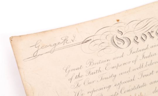 A WWI First World War interest Officer's Commission certificate to a Second Lieutenant Francis Albert Barker. Dated 25th September 1918. Laid on to card. Printed King George V signature to top corner. Total size: 29cm x 40cm.