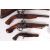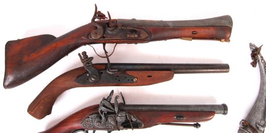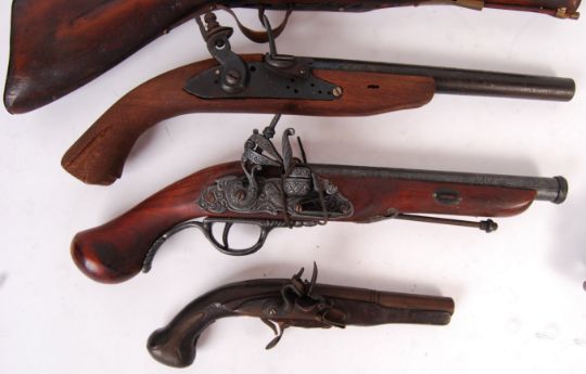 A collection of 4x vintage replica / display Flintlock pistols. All made of wood and metal, to varying degrees of quality. Some with functioning actions, others not. Along with a reproduction cast metal decorative powder flask / horn.