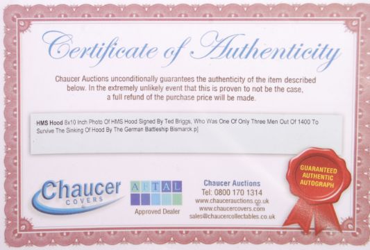 A rare HMS Hood 8x10" black and white photo signed by survivor Ted Briggs. Briggs was one of only three men out of 1,400 who survived the sinking of the Hood by the German battleship ' Bismarck '. Signed in black marker to a light portion. With certificate of authenticity. Albert Edward Pryke "Ted" Briggs MBE (1 March 1923 – 4 October 2008) was a British seaman and the last survivor of the destruction of the battlecruiser HMS Hood. He remained in the Royal Navy after the Second World War and was later commissioned.