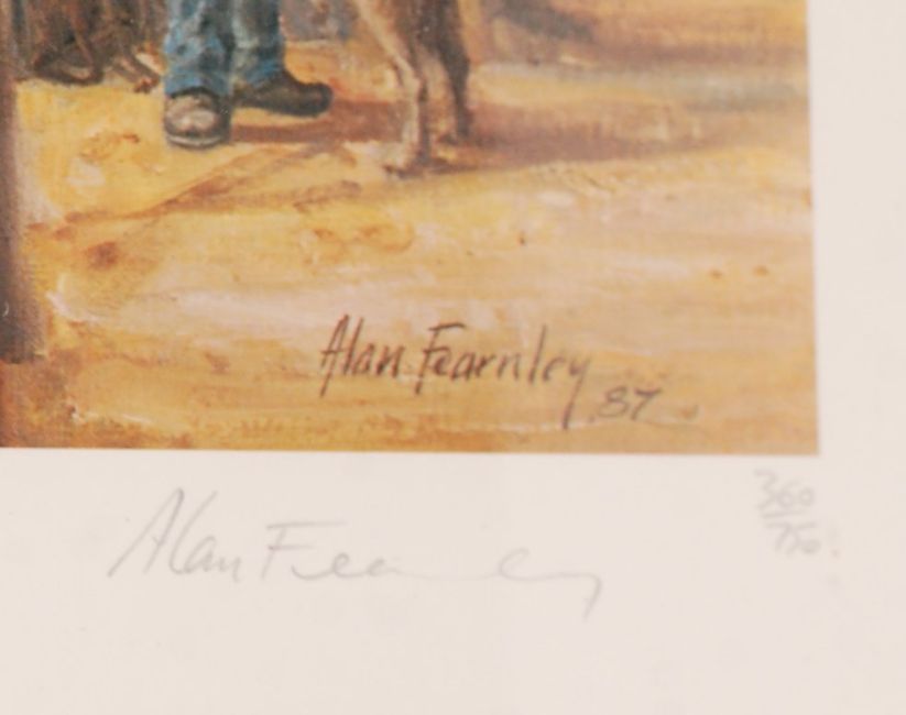 A 20th Century signed coloured print entitled 'Northbound Steamer' after Alan Fearnley depicting the boarding of a steam boat in Confederate Civil War America. Signed in pencil to the corner, framed and glazed. Measures approx; 69cm x 89cm.