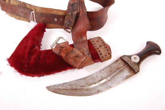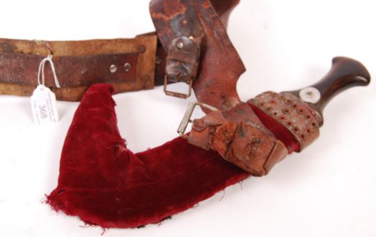 A 20th century South Arabian / Yemen Khanjar Jambiya (Jambya) dagger having a horned handle adorned with a South Arabia coin, ridged curved blade along with a felt covered scabbard and leather sword belt.