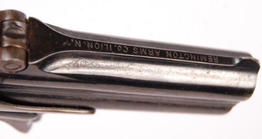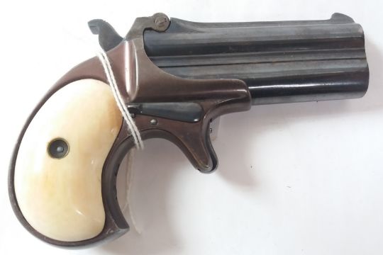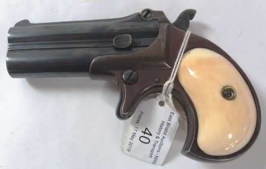 An antique Remington Arms Company made Derringer double barrelled over and under pistol. Stamped with maker and ' Ilion NY ' to top of barrel. Fitted with ivory grips to the steel frame, and a spur trigger. Action in full working order. Measures approx; 13cm long.