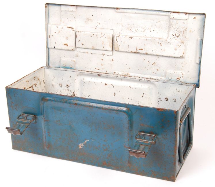 An original WWII Second World War G&ML ' 1944 ' ammunition crate. Steel construction, with carry handles to each side. Notation impressed to top. Measures approx; 48cm long.