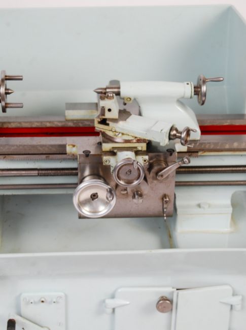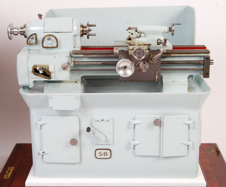 An incredible rare vintage ' Smart & Brown ' salesman advertising example miniature model lathe ' Model A Toolroom Lathe '. Incredibly highly detailed miniature version of the full size lathe, it comes fully engineered as made by Smart & Brown, and likely for an exhibition or salesman's sample model. Precision engineered, and one of the best model lathe's we have ever seen. Housed within it's original mahogany locking case (key present) and housed under perspex. Measures approx: H37cm x W46cm x D31cm. Charming and rare example.