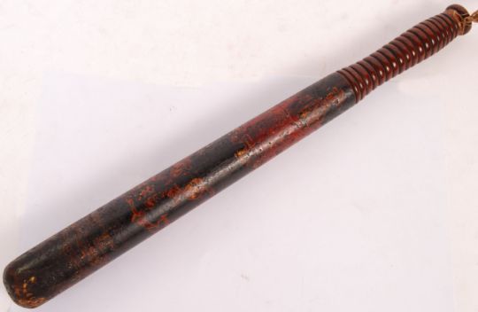 An antique late 18th / early 19th century Police / Naval truncheon. Original paint to body, with some notation faintly visible. Turned ribbed handle. Measures approx; 38cm long. Rare.