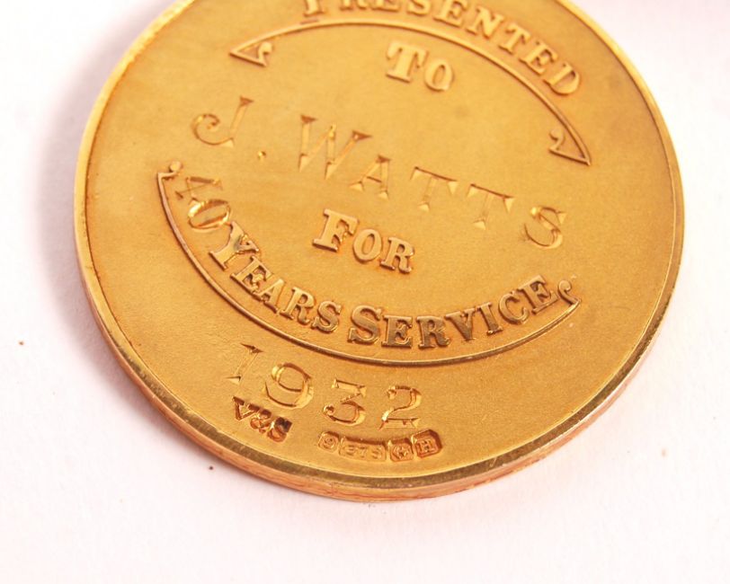 A rare 1930's 9ct gold hallmarked ' 40 Years Service ' medal. Engraved to verso for J. Watts '. Issued by Imperial Chemical Industries ( ICI ). With ribbon, in its original presentation box. Weighs 24g total weight.