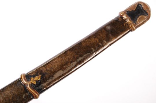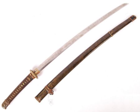 A WWII Second World War Japanese Naval Army Officers Shin-Gunto sword katana and scabbard having a fabric bound and ray skin clad hilt with brass furnishings and adornments being decorated and a triple flower menuki, the tsuba also being decorated flower design. The scabbard having a push release button to the hilt and being finished in a laquered azurine finish with metal furnishings and chinese calligraphy to the top. The blade being of high quality with a good edge (one small knock) and the tang having Showa period manufacture and dated chinese glyphs pre dating 1942. Measures; 103cm overall. (Comes with research paperwork)