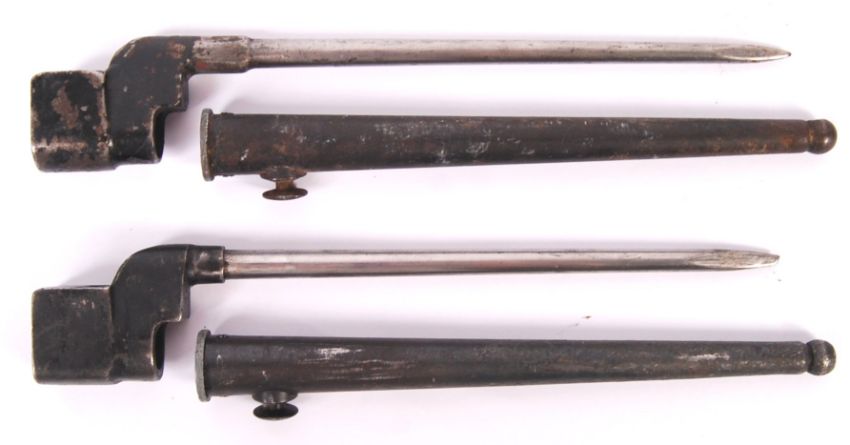 Two WWII Second World War British issue military No.4 Mk II ' Pig Sticker ' 'Spike' rifle bayonets. Both with their original steel scabbards. Measures; 26cm