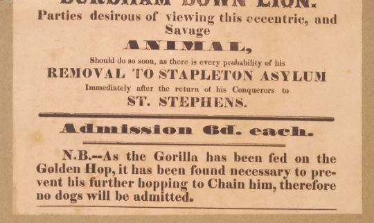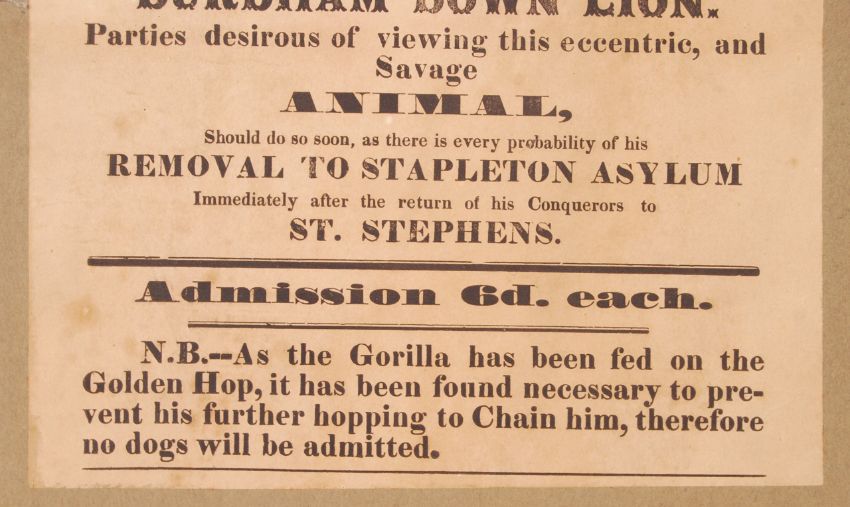 A rare and interesting local Bristol interest late Victorian 19th Century c1850's advertising poster 'See The Excited Gorilla Of Wine Street ' ' For A Short Time Only In Bristol, Up The Passage - To Be Seen Alive ' '...Only To Be Equalled By The Durdham Down Lion'. Mounted on a board with another similar aged political poster mounted to the other side regarding Lord Palmerston. Please view images. An incredibly rare piece of Bristol memorabilia. The posters measure approx; 38cm x 26cm.