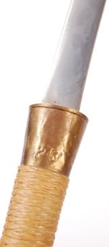 A Vietnam era 20th century Dha Sword having a straw grip handle with brass collars to top and bottom with a fantastic shaped blade with repeating marks on either side to the bottom half and top half of the blade set within a teak scabbard. Measures; 82cm overall.