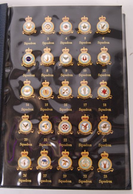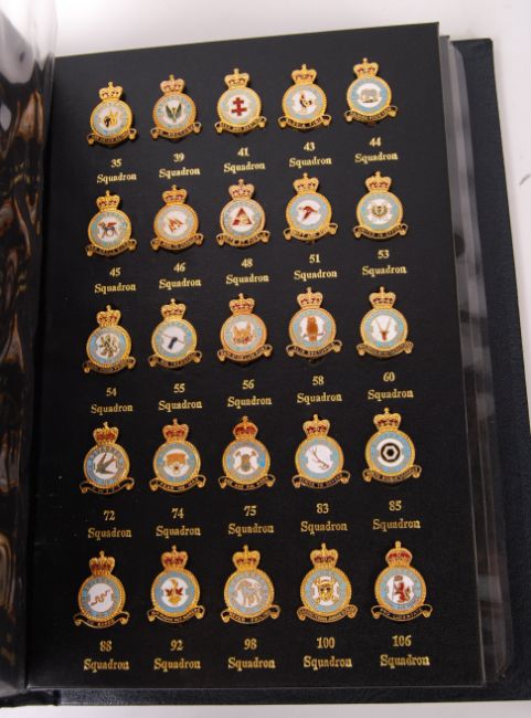 A rare RAF / Royal Air Force Museum produced leather portfolio book of 100x military RAF Squadron Badges. All having gilt and enamelled crests to each. Beautifully displayed within their original presentation album. A rare display.