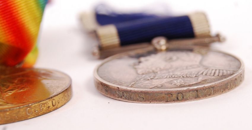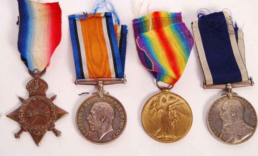 A WWI First World War medal group belonging to a 175194 T. Sims - Chief Petty Officer in the Royal Navy. Comprising of: War Medal, 1914-15 Star, Victory Medal and his Long Service & Good Conduct medal. All impressed to rim. Along with Sims' Princess Mary Christmas Gift Tin (empty) and a small silver ' May 31st 1916 The German Fleet ' miniature medal. Interesting medal group, consigned from family.