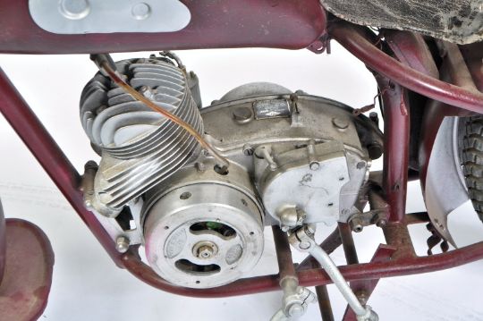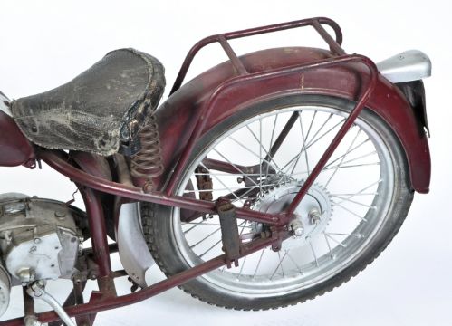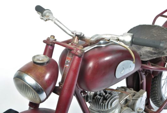 A vintage 1950's Hirondelle ' Type D ' 125cc motorcycle. Fitted with a (presumed) 125cc ' Ydral ' S Series engine. Red painted, with original leather saddle. Presumed original number plate present to verso which reads ' 919 AE73 '. The bike comes non-running, with nothing connected up and very much 'for display purposes'. Later painted in red and silver. No V5C or any other paperwork present. Originality and provenance unknown, and buyer discretion is advised. NATIONWIDE DELIVERY AVAILABLE: Please click on the 'shipping' tab next to the description and view rates for 'Furniture Delivery'.