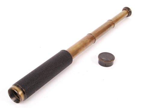 An early 20th century 'Falcon' 22x brass and leather three draw pocket telescope by Enbeeco London with engraved marks to the sight end. Complete with the original cap. Measures; 20cm closed.