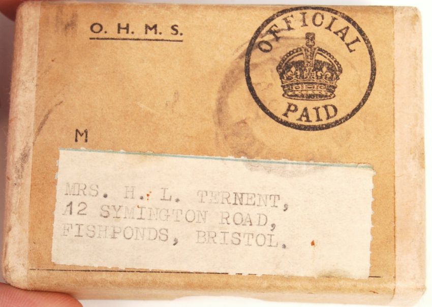 A local interest WWII Second World War Bristol related medal group - comprising of War Medal (with ribbon), Air Crew Europe Star (with ribbon) and ribbons for the other two medals (medals not present). Within their original box of issue, sent to a Mrs H.L. Ternent of Fishponds, Bristol. Interesting medal group.
