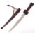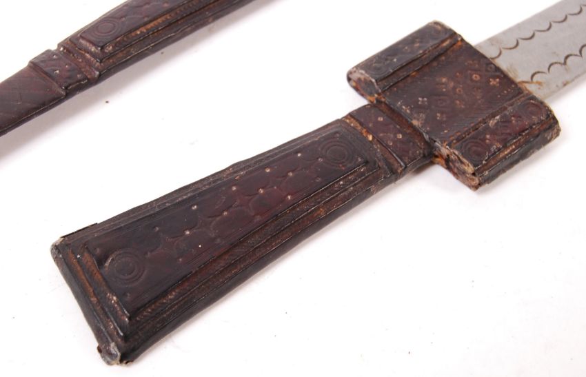 A North African Sahara 19th to early 20th century tribal Tuareg (Twareg or Tourareg) short sword having a clad tooled leather handle of traditional form, steel curved double edged blade with crescent shaped detailing to one side of the blade along with a tooled leather scabbard with ball end.