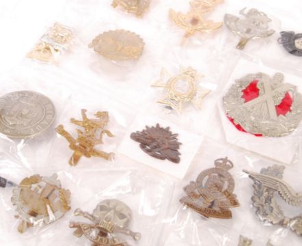 A large collection of x30 assorted military cap badges - from various 20th century conflicts. Badges include: Royal Artillery, Australian Commonwealth,  Royal Leicestershire, RAOC, Inniskilling, Essex Regiment, RAF and others. Largely contemporary, but some older included.