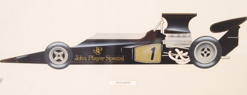 A rare piece of believed 1970's Brooke Bond Tea Card unused artwork, appearing to be based on ' The History Of The Motor Car ' series of collector's cards. Airbrush, watercolour and mixed media painting. This piece depicting a 1972 Lotus John Player Special, in black, with No.1 decals. Framed and glazed to a total size of: 32cm x 42cm. Rare. Beautiful artwork.Provenance: From the offices of the last Managing Director of Vandervell’s in Maidenhead before the company’s closure in 1997. GKN bought the company following the death its founder, Tony Vandervell, in 1965. Consigned from the family.