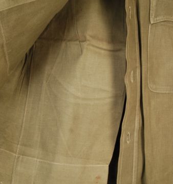A Post-WWII Second World War 20th century Singapore District uniform - comprising shirt and shorts. The late 1940's pea-green Aertex shirt with stitched cloth Singapore District formation patches. Matching shorts.