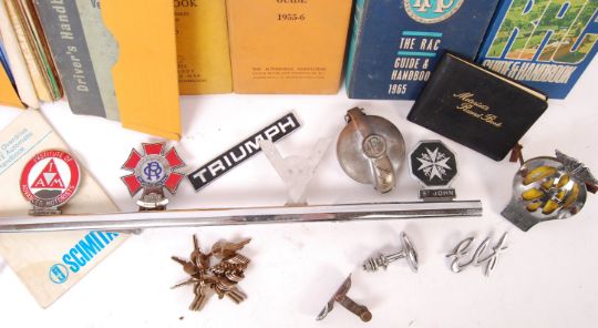 Automobilia - a good collection of assorted 1950's / 1960's automobilia / motoring interest ephemera, badges and related. To include various AA and RAC guides / books, an unused ' Motorist's Record Book, an AA badge, owner's manuals, fuel filler cap and other items. Interesting collection.