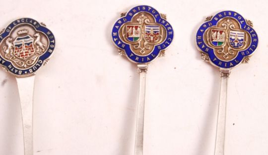 A collection of x6 rare vintage early 20th century 1920's ' Bath & Bristol Motor Club ' hallmarked silver spoons. x4 with enamel decoration for ' Interclub Trial ' and x2 with ' Motor Club ' decoration. Some engraved to back with winners of Hill Climbs, Mallory Cup etc. Rare and interesting collection. 125g total weight.