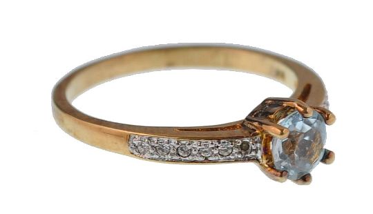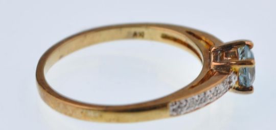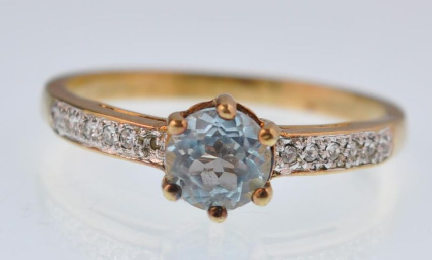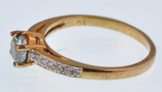 A 9ct gold single stone aquamarine coloured stone being claw mounted, the central stone approx 25pnts. Diamonds to shoulder approx. Size U, Total weight  2.5g.