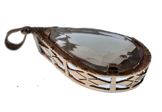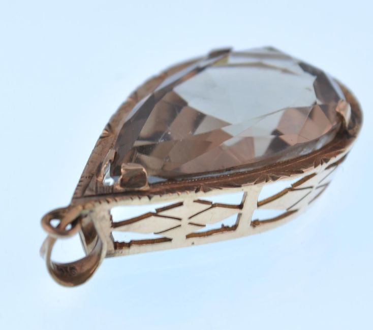 A large vintage 9ct gold pendant set with a pear cut smokey quartz in a pierced setting.  Marked 9ct, tests 9ct gold. Total weight 8.2g. Measures 4cms.