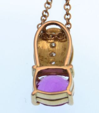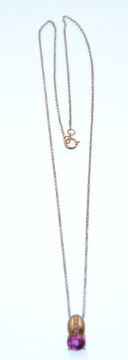 A pink sapphire and diamond pendant necklace. The pendant in the Art Deco style having  an oval cut pink sapphire of  approx. 1.25cts, surmounted by a small diamond line.  Chain measures approx 18 inches.