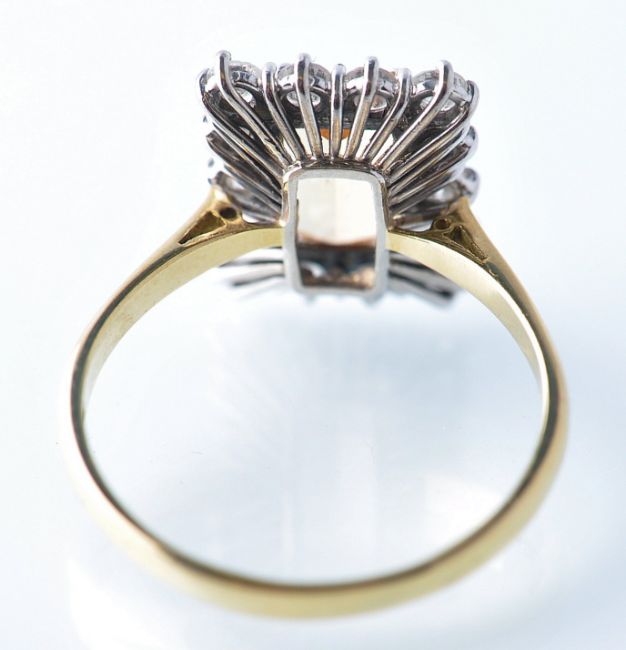 A hallmarked 18ct gold ring set with a central faceted citrine with a halo of 14 diamonds. citrine stone approx 20pts, diamonds of approx 70pts each. Hallmarked London 1977. Weight 5.0g. Size U.5.