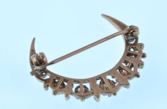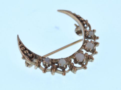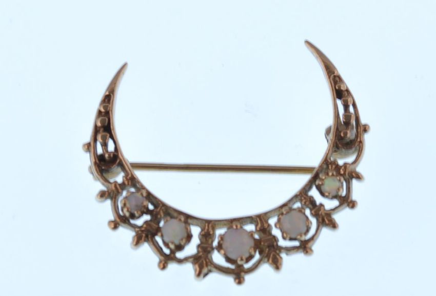 A 9ct gold and opal ladies London hallmarked crescent moon shaped brooch.5 graduating round cut opals being claw mounted with pin verso. London hallmarked for 1987. Total weight 3.54g / Size 3cms long