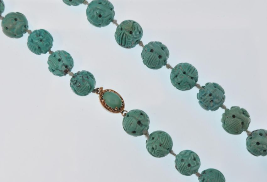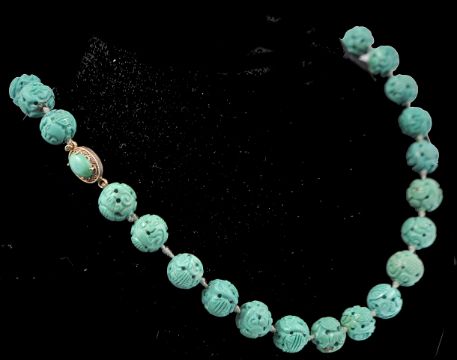 An early 20th century French carved turquoise colour bead necklace. The beads carved depicting Chinese symbolism,  Shou for longevity, completed with a filigree decorated clasp. Marked silver with French assay mark. Measures 20 1/2 inches.