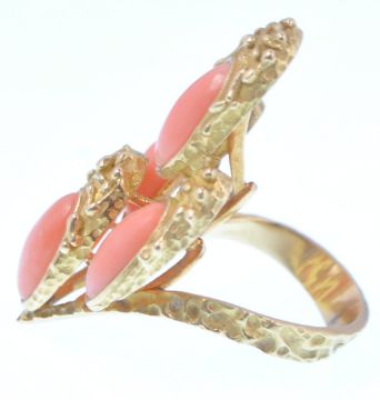 A 1970's French 18ct gold and coral wishbone ring. The ring being set with four oval coral cabochons, within a stylised overlaid setting, having a textured wishbone shank. French eagle mark and sponsor mark to outside of shank. Total weight 11.7g. Size L-M.