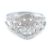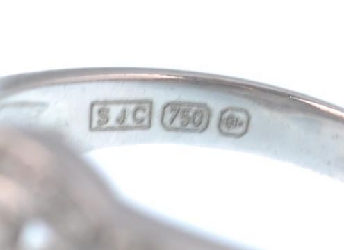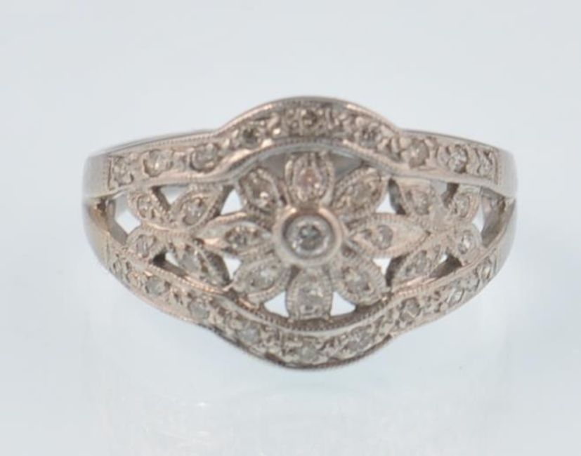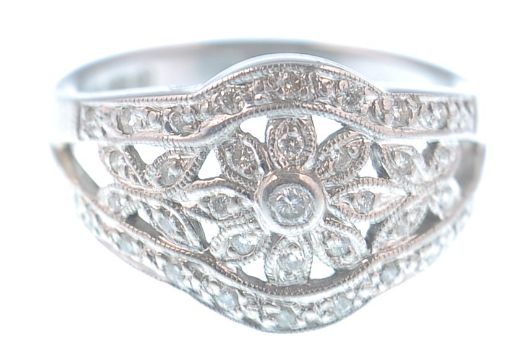 A hallmarked 18ct white gold and diamond ring having a pierced floral design set with accent diamonds. Weight 5.8g. Size N.