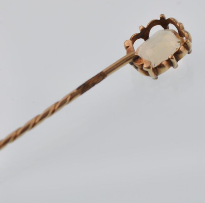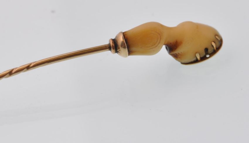 Three 19th century gold cravat stick pins. The pins having decorative finials to include a banded agate drop, a golden topaz, and a carved ivory hoof. Measures approx  agate and topaz 2 1/2 inches  and ivory 3 inches. Unmarked tests approx 9ct gold. Weight 4.6g.