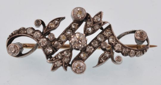 A silver and gold 19th century Victorian bold cut diamond brooch of tulips, Lily's and scrollwork scroll and foliates. Completed with c-clasp. The diamonds estimated weight 0.75cts. Size 4cms / weight 4.19g