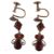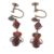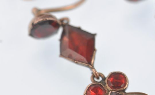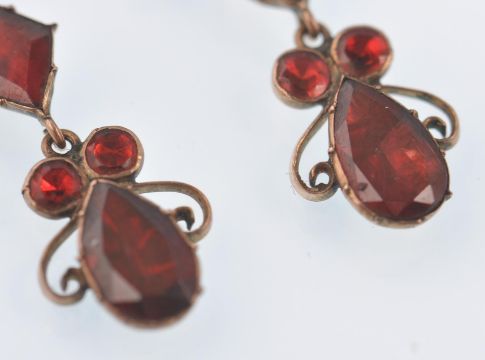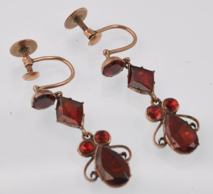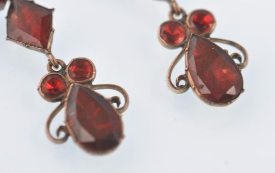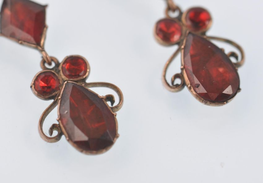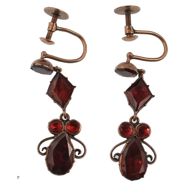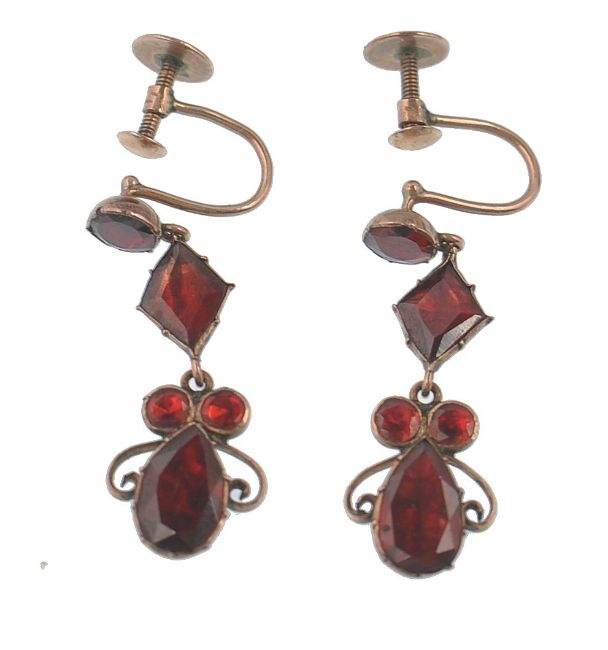 A pair of 19th Century Georgian garnet drop earrings having central faceted pear shaped garnet with scrolled mount flanked by two smaller garnets. Central diamond cut garnet with larger circular garnet above. Attached to later Victorian screw backs. Weighs 2.1 grams. Drops 3cm drop.