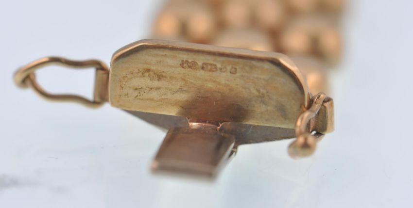 A 9ct gold import hallmarked ' pebble ' bracelet strap having illusion set 3 string design of pebbles with hallmarked clasp complete in the presentation case. Total weight 24g / Length 18cms