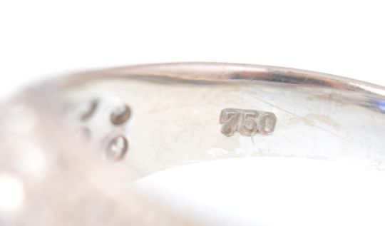 An 18ct French import assay mark white gold sapphire and diamond bombe / dome head ring. Marked 750, the ring with central oval sapphire estimated weight 1.08ct with surround of pave set diamonds. Estimated diamonds 0.80ct weight. Size R / Weight 6g
