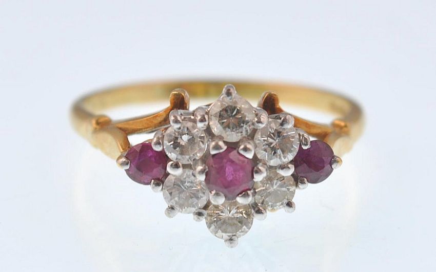 A hallmarked 18ct gold ruby and diamond cluster  ring having a central ruby approx 10pnts being claw mounted and a cluster of diamonds being interspersed  by ruby stones. Weighs 3.9 grams size S. Diamonds total approx 50pts, ruby stones approx 20pts