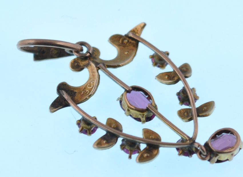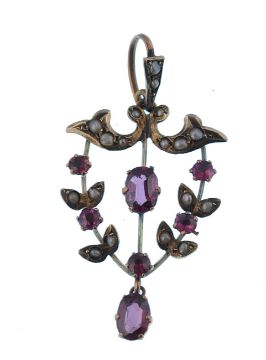 A 19th century Victorian Art Nouveau amethyst and seed pearl ladies necklace pendant. Shield shaped, the bale with adorned seed pearls and amethyst droplet at base. Measures 3.5cms tall approx / 1.83g weight