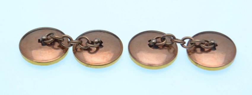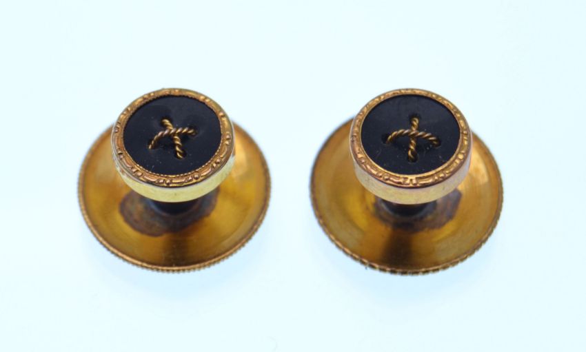 A set of early 20th century  9ct gold and onyx cufflinks and collar studs in a fitted case. Marked 9ct. Total weight 6g.