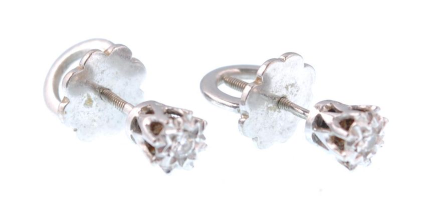 A pair of 18ct hallmarked Birmingham white gold and diamond earrings / studs with posts. The claw mounted single stone diamonds approx 5pnts each. Birmingham hallmarked. Total weight 3.35g