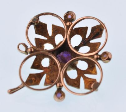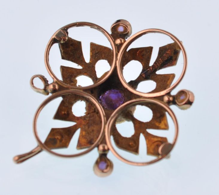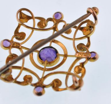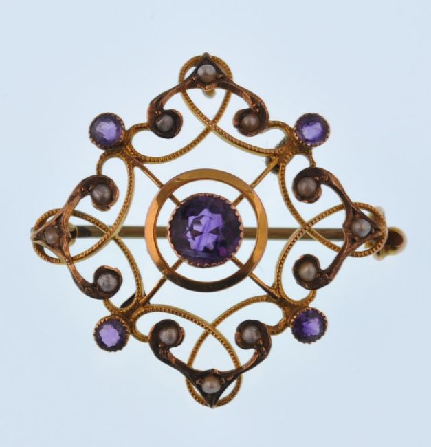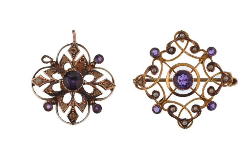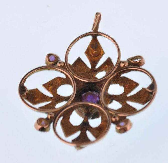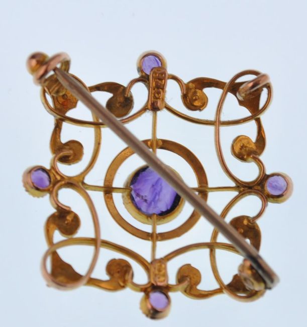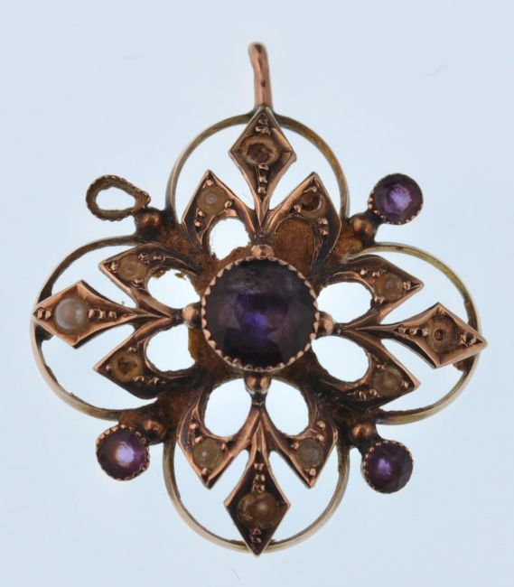 A Victorian art nouveau 9ct gold, seed pearl and amethyst ladies brooch of diamond form being filigree worked with amethyst and seed pearls together with a similiar 9ct gold necklace pendant with seed pearl and amethyst. Measures 3cms x 3cms  / pendant 2.5cms x 2.5cms