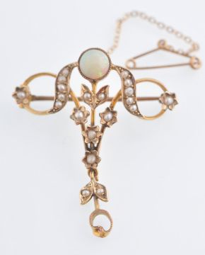 A Victorian 9ct gold opal and seed pearl belle epoque brooch. Round opal ( 5mm ) above an adornment of swirling seed pearls with drop beneath ( missing stone ) having pin verso and safety chain. Total weight 4.23g / length 4cms