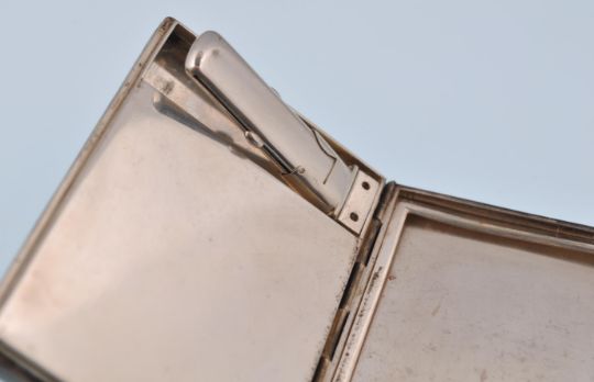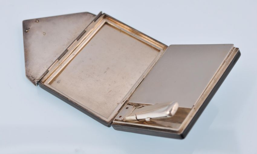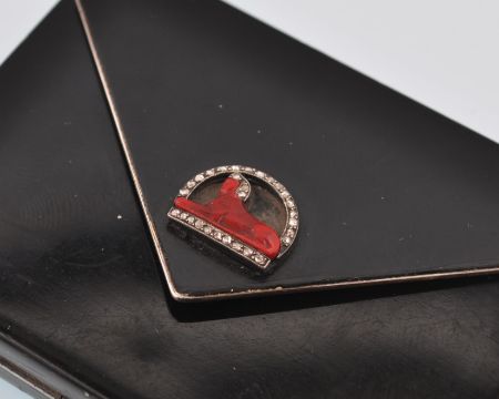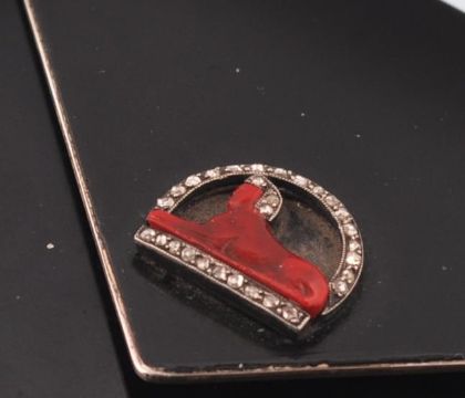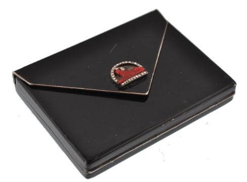 An early 20th century French Art Deco silver, enamel, diamond compact vanity case. The compact being of rectangular envelope design with black enamel decoration, having a moulded red glass Egyptian Sphinx figural clasp set with rose cut diamonds. The compact opens to reveal a removable lipstick holder with push mechanism, with further covered compartment. Dates to circa 1920. French assay marks plus makers mark, number 87. Total weight 120g. Measures 7cms x 5cms.