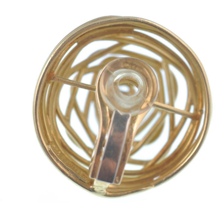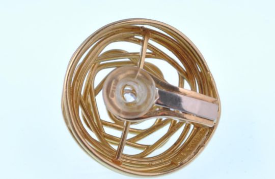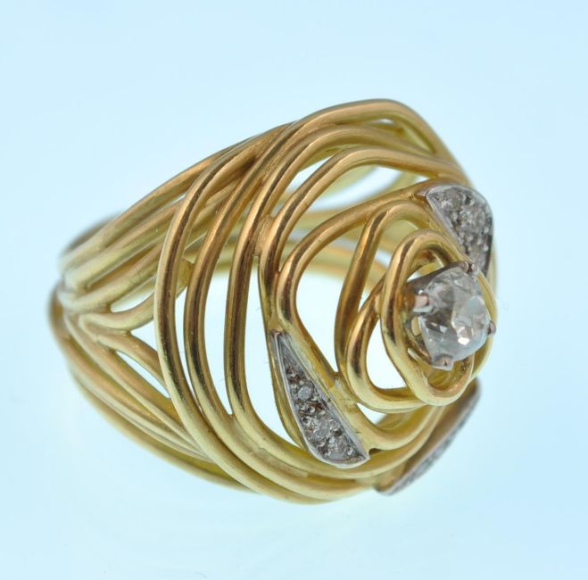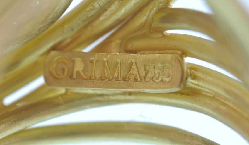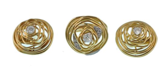 A 18ct gold and diamond ring and earring suite by Grima. The ring having an open wirework domed naturalistic design embellished with white gold crescents set with brilliant cut diamonds  surmounted with a central old cushion cut diamond. The earrings set with a round brilliant cut diamond set within a wire work mount completed with clip fasteners. Marked Grima 750.  Ring principle diamond estimated weight 0.70cts.  Ring estimated total diamond weight 0.80cts. Ring total weight 18.8g.  Ring Size T.  Earrings estimated diamond weight  0.45cts each. Total estimated diamond weight 0.90cts. Total weight 22g.