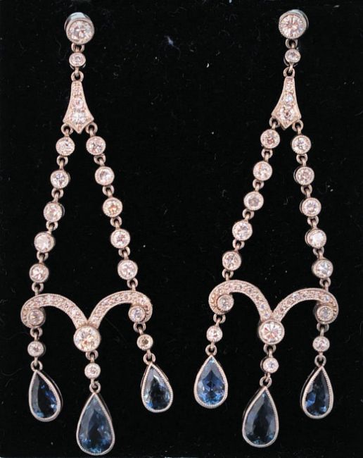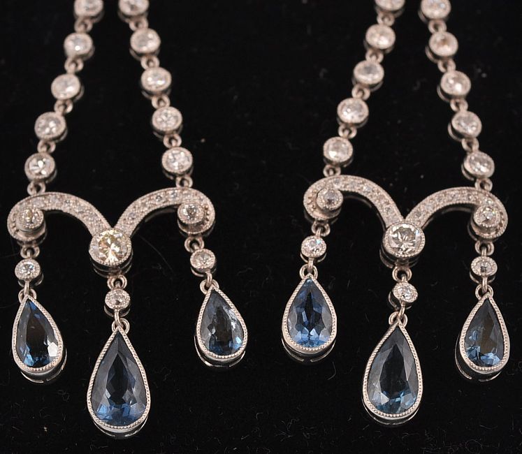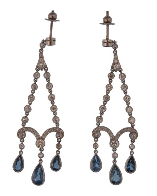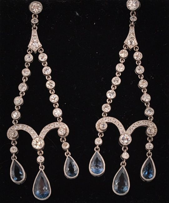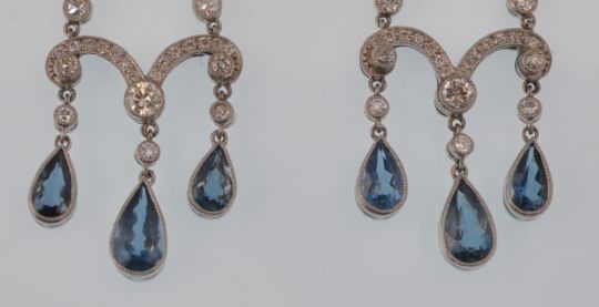 A pair of platinum Belle Époque diamond and aquamarine chandelier earrings. The earrings having dual diamond set strands coupled by a diamond set scroll with three aquamarine drops. Completed by screw post fasteners. Measures 1 3/4 inch drop. Estimated diamond weight 1.5cts. Estimated aquamarine weight 3cts. Total weight 11.6g