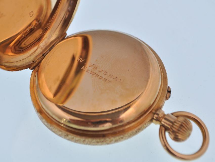 An early 20th century 18ct gold ladies half hunter repeater fob watch with floral chase decorated case having a guilloche enamel chapter ring to outer case, inset roman numeral chapter to face with faceted hands. Crown winder with bale atop. Measures 3.5cms diameter. Weight 40.05g